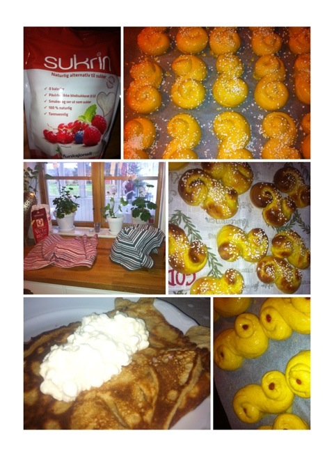 Idag har jag bakat lussebullar. En sats vanliga och en sats med GI-bullar. I GI-bullarna har man Sukrin och fruktsocker istället för vanligt socker. Och dinkelmjöl istället för vetemjöl. På de vanliga har jag pärlsocker – för familjen petar ändå bort russinen (och för att russinen i skafferiet var från 2009…) På GI-bullarna har jag gojibär.