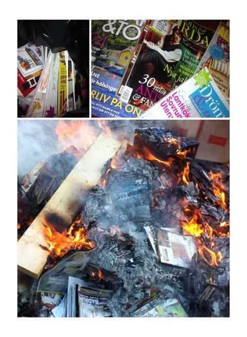 Idag kunde jag äntligen skiljas från alla mina tidningar. Det blev en stor nyårsbrasa. Ut med det gamla – välkomna det nya 🙂 Jag fick träning på köpet – sprang fram och tillbaka och fyllde på med fler tidningar och även annat skräp som jag hittade.