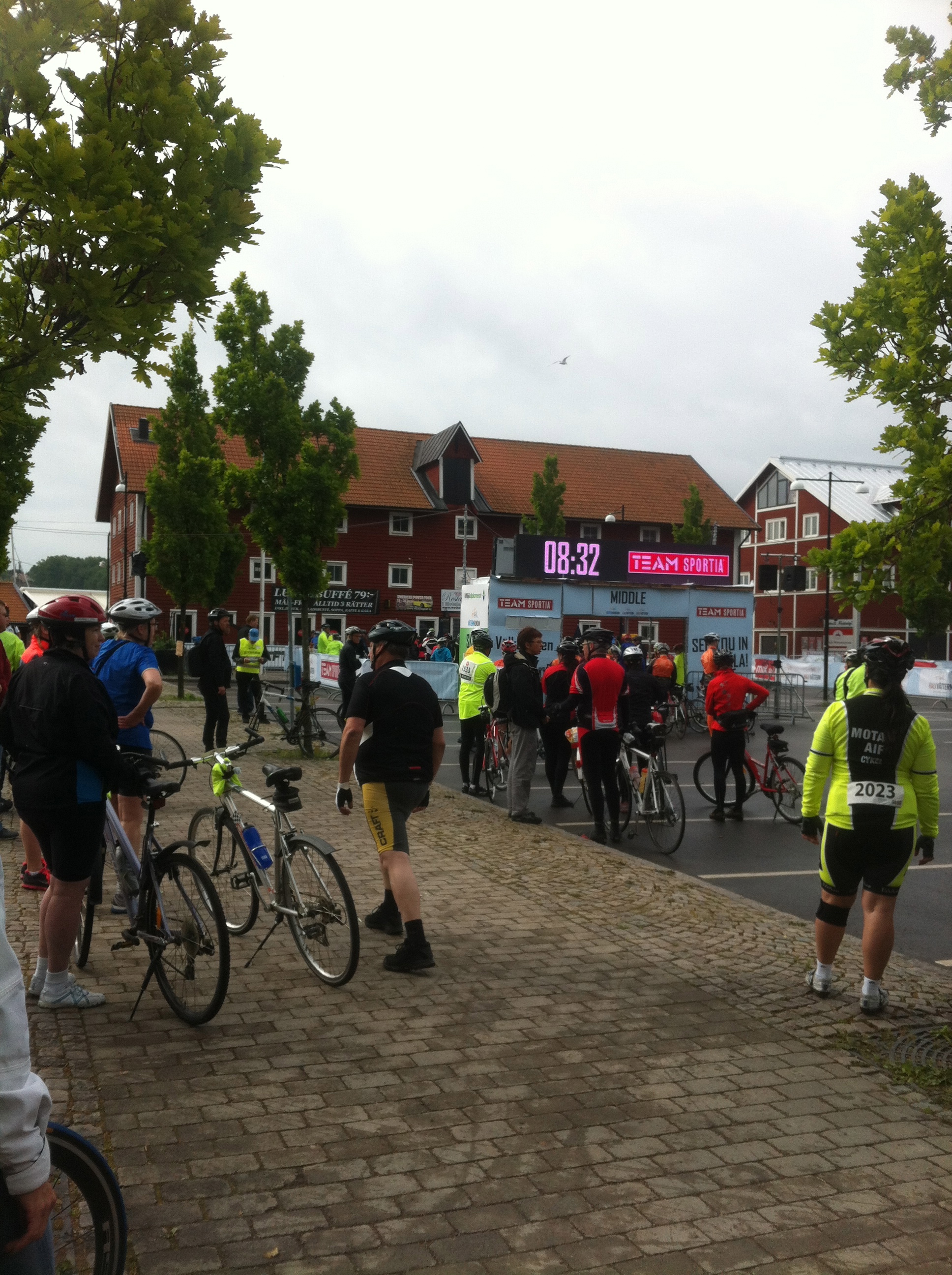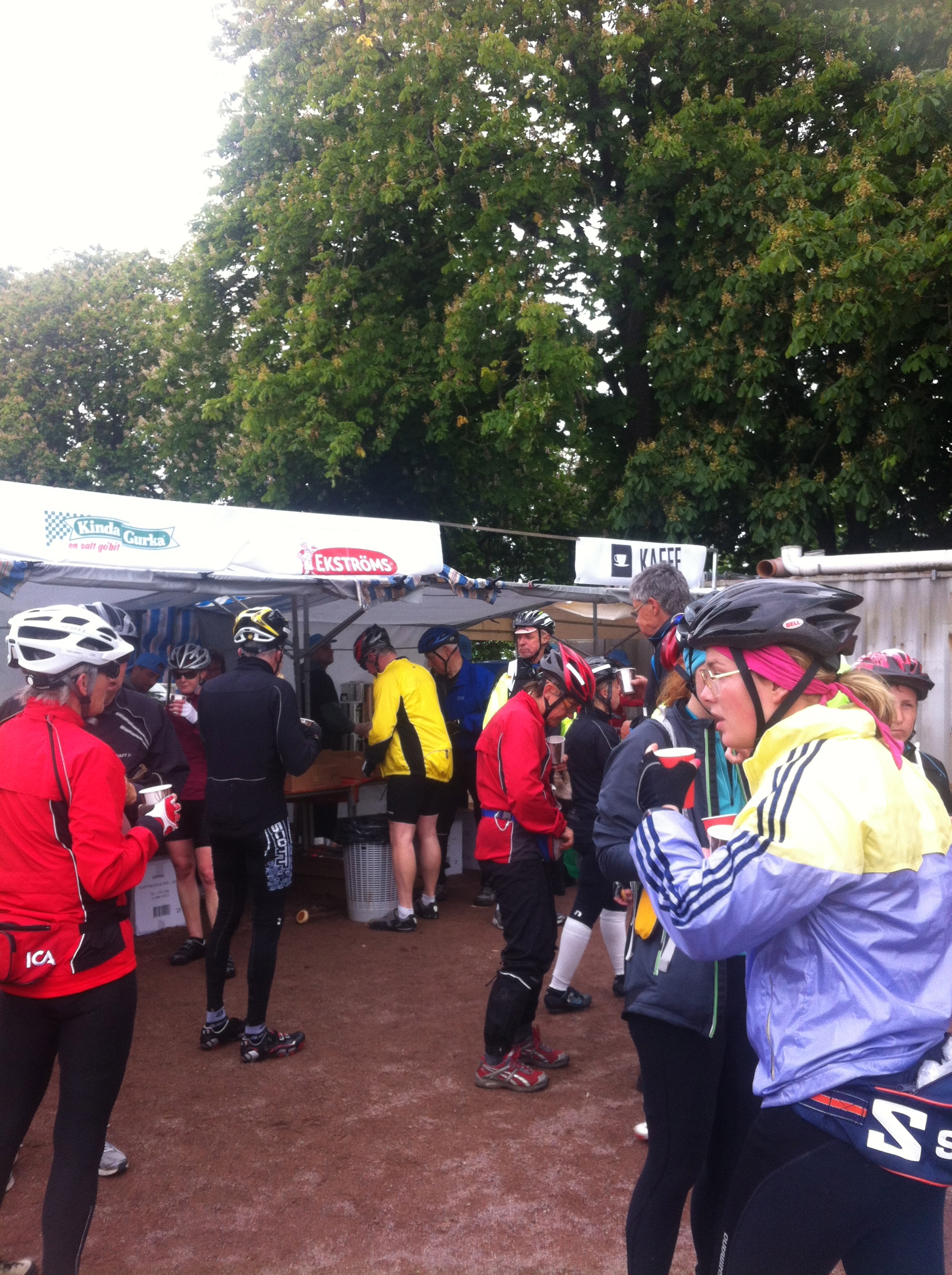 När jag svänger upp mot målet så har det slutat regna och jag känner mig så glad! Jag klarade det! En man cyklar upp brevid mig och tackar för att jag dragit honom de sista 15 km när han var helt slut. ”Det var så lite så, jag har inte märkt nåt” Alltid kul att få hjälpa till 🙂