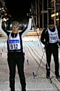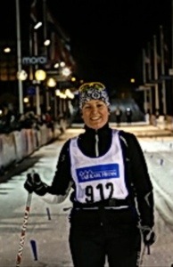 Från Eldris är det belysning – åh vilken skillnad! Det är mycket stakning och det är tur för fästet vi fick hjälpte inte ett dugg. Vi åker och småpratar med en tjej som är rejält trött men vi bara räknar ner km skyltarna och det känns helt fantastiskt att snart ha klarat 9 mil på skidor. När vi åker in på målrakan har jag fortfarande krafter kvar att staka – jag fattar inte. Janne blev slut i armar och axlar rätt tidigt av all stakning men jag måste ha fått till tekniken på stakning i år för jag är inte alls trött i armar och axlar. Mina knän värker och två av mina tår värker och blåsan i handen skaver men jag är så glad när jag åker över mållinjen 🙂