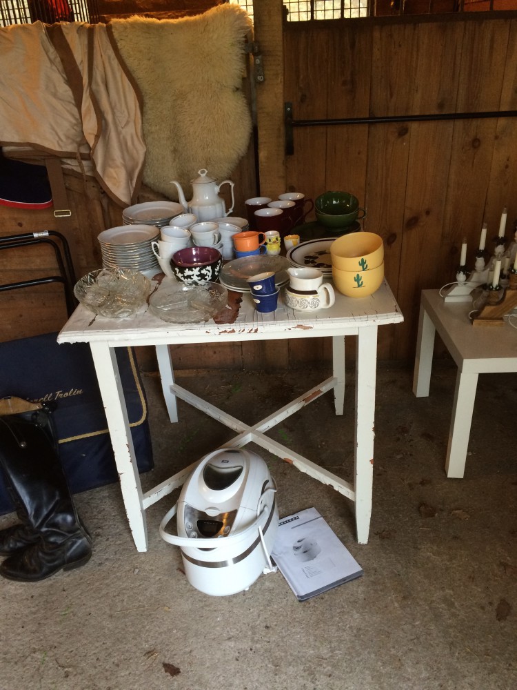 Upp tidigt på söndag morgon och började ställa ut grejer i stallet. Faktiskt så kom det folk under hela dagen och vi blev av med en hel del grejer. Priserna på sakerna var valfritt bidrag till Bröstcancerfonden – och vi fick ihop 2800 kr! Pengarna är insatta på Rosa Bandet på en insamling som heter Flytt-Loppis. Eftersom vi fick grejer över så fortsätter försäljningen under oktober så att jag kan samla in mer pengar. Jag hoppas få ihop 5000 kr 🙂
