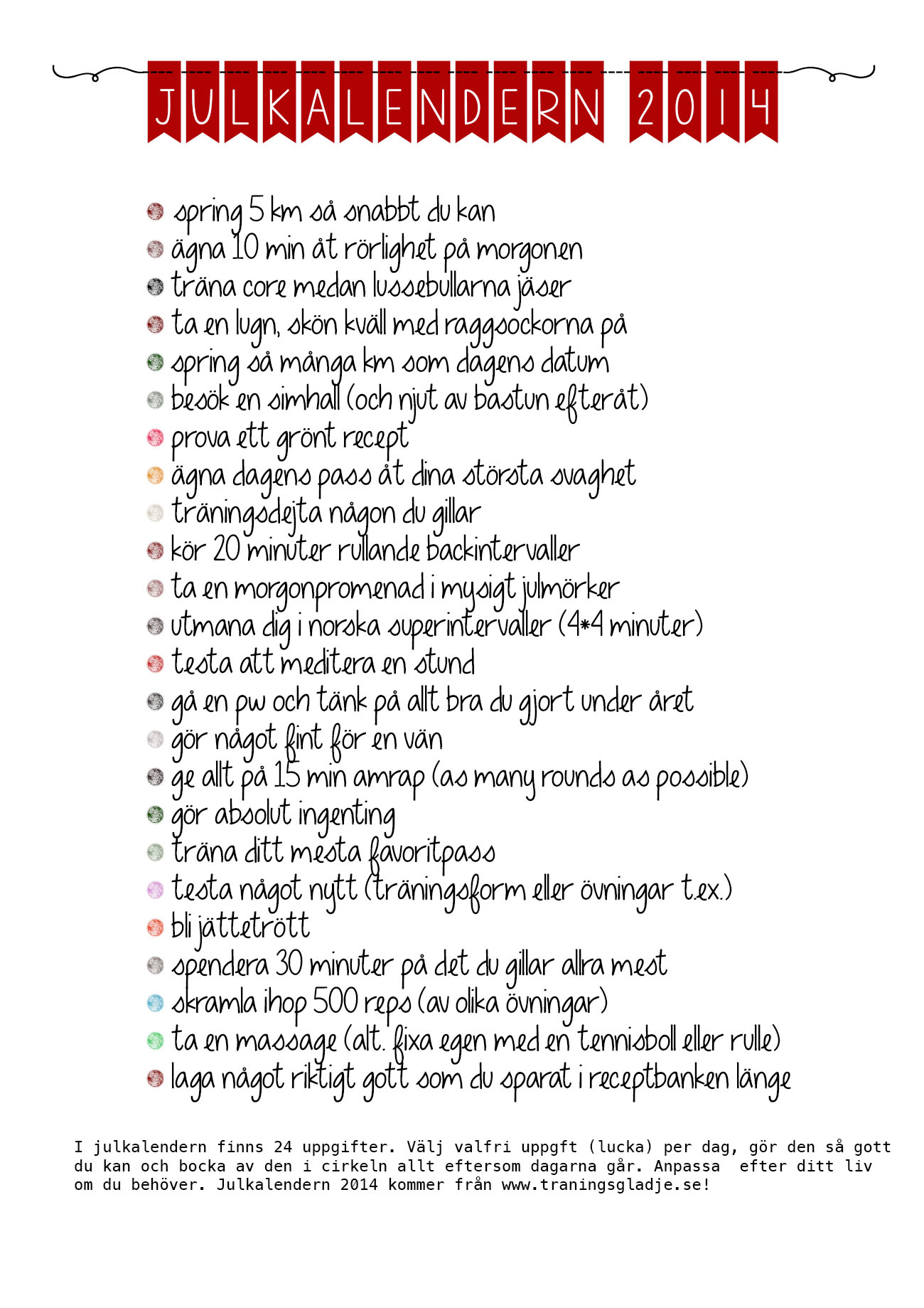 Sara aka Träningsglädje har även detta år lagt upp en härlig julkalender med lagom utmaning som alla kan vara med på.