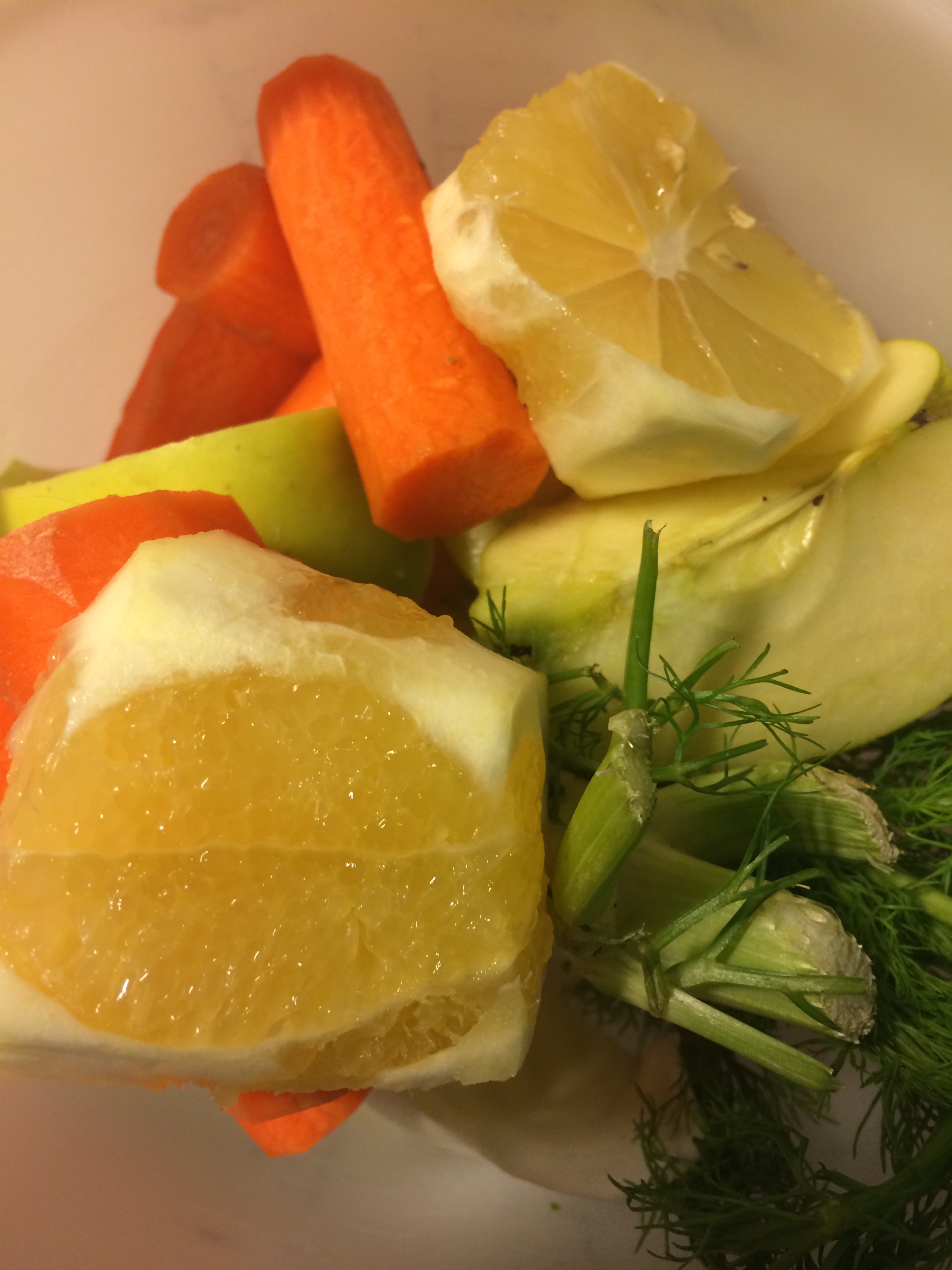 Till em blir det en orange juice med morot, gurkmeja, fänkål, citron och äpple.