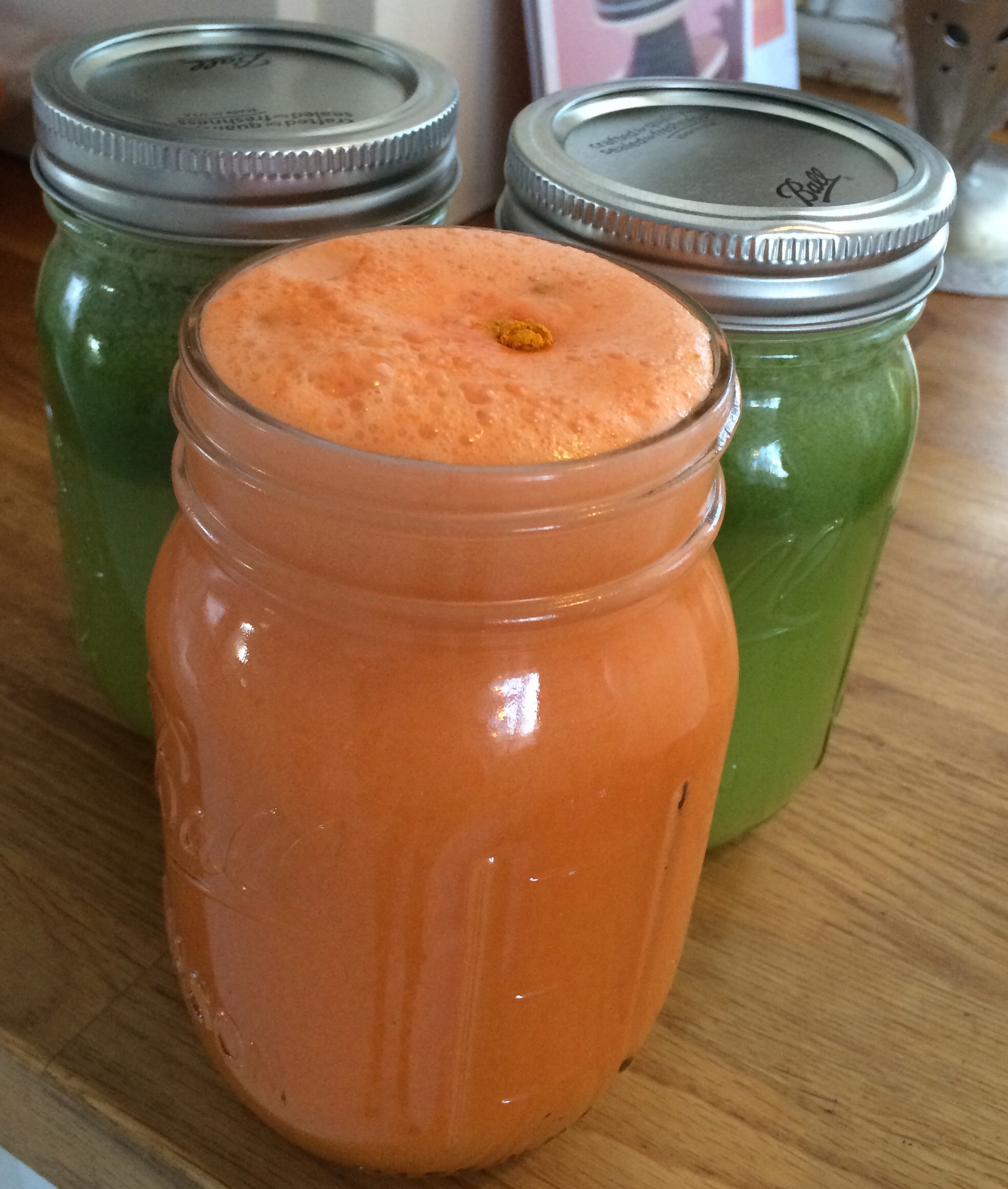 Juice-dag idag och det tar sin lilla tid att preparera dagens juicer men nu står de i kylen redo att avnjutas 😉 Jag håller på att samla mig för den gröna – urk. Idag hade jag i grönkål i den också – får se hur det smakar. Resten av grönkålen ligger i ugnen nu och ska bli grönkålschips till kvällens farmen.