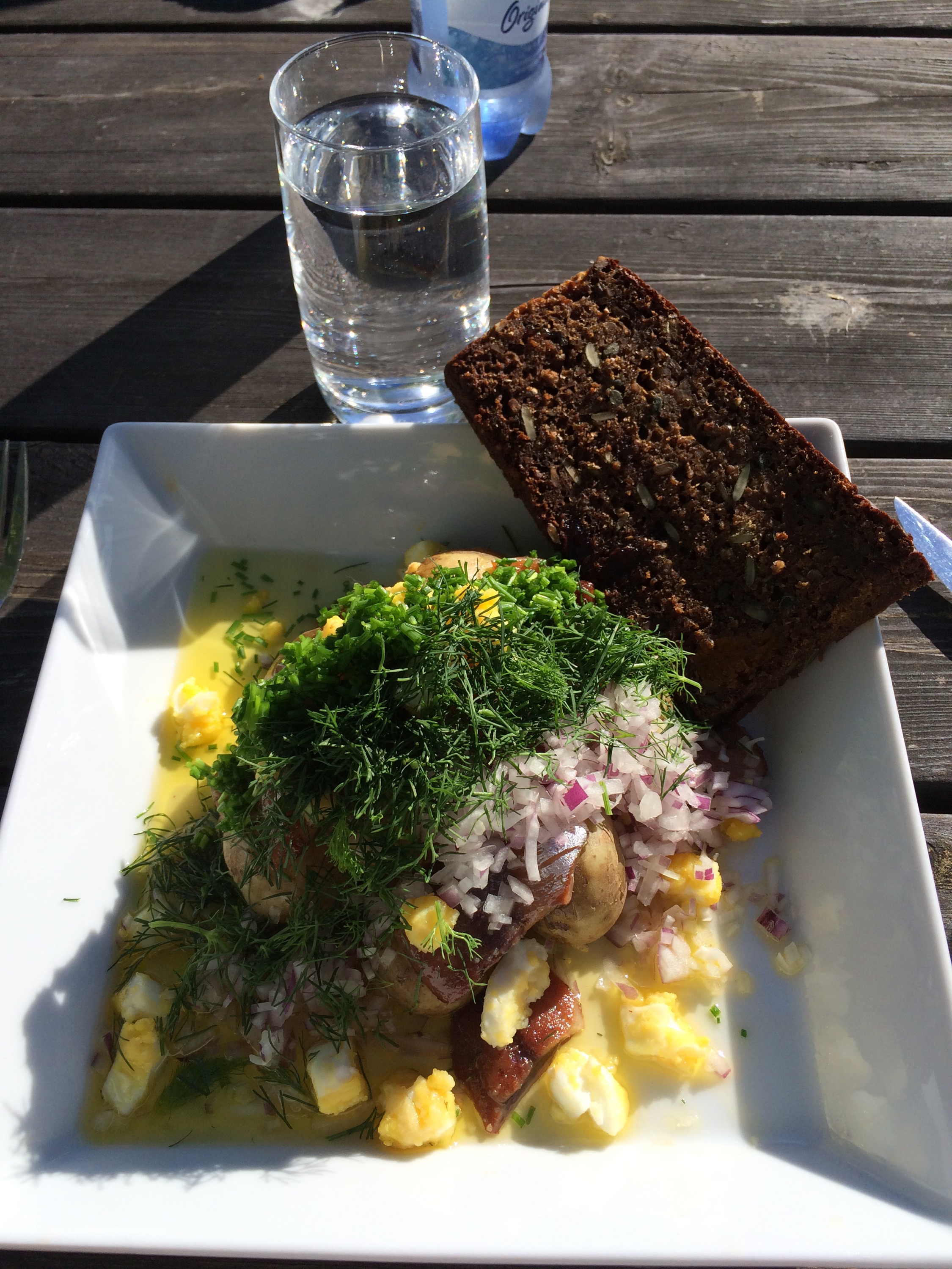 Färskpotatis, matjessill, ägg, massor av dill, gräslök, rödlök och sedan brynt smör. Supergott! Rekommenderar ett besök i vackra Stjärnsund. Vi satt vid vattnet och njöt av solen.