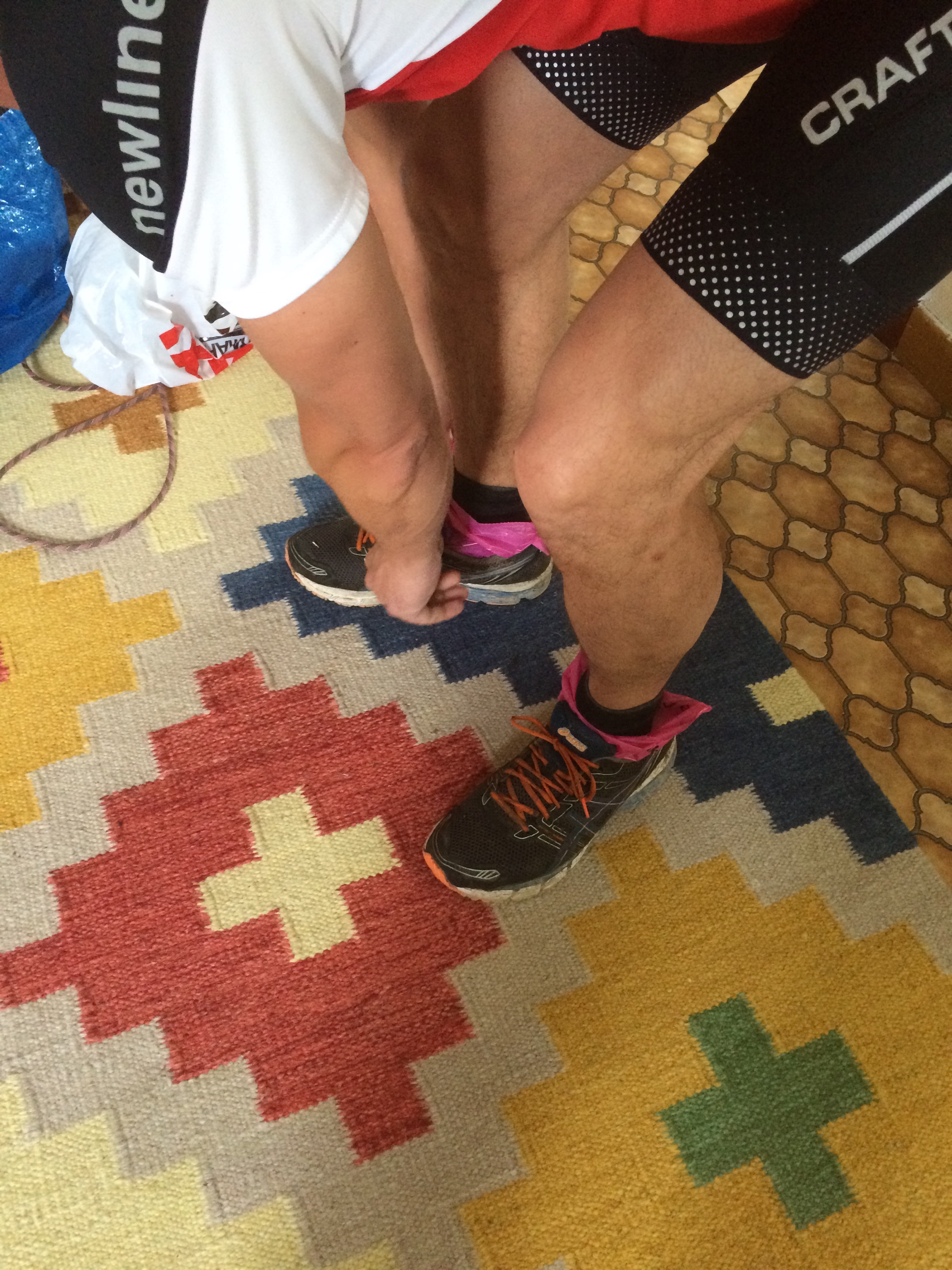 Paketerade sedan Jannes fötter med hundbajspåsar 😂 eftersom skorna var blöta och luktade dy efter Tough Race.