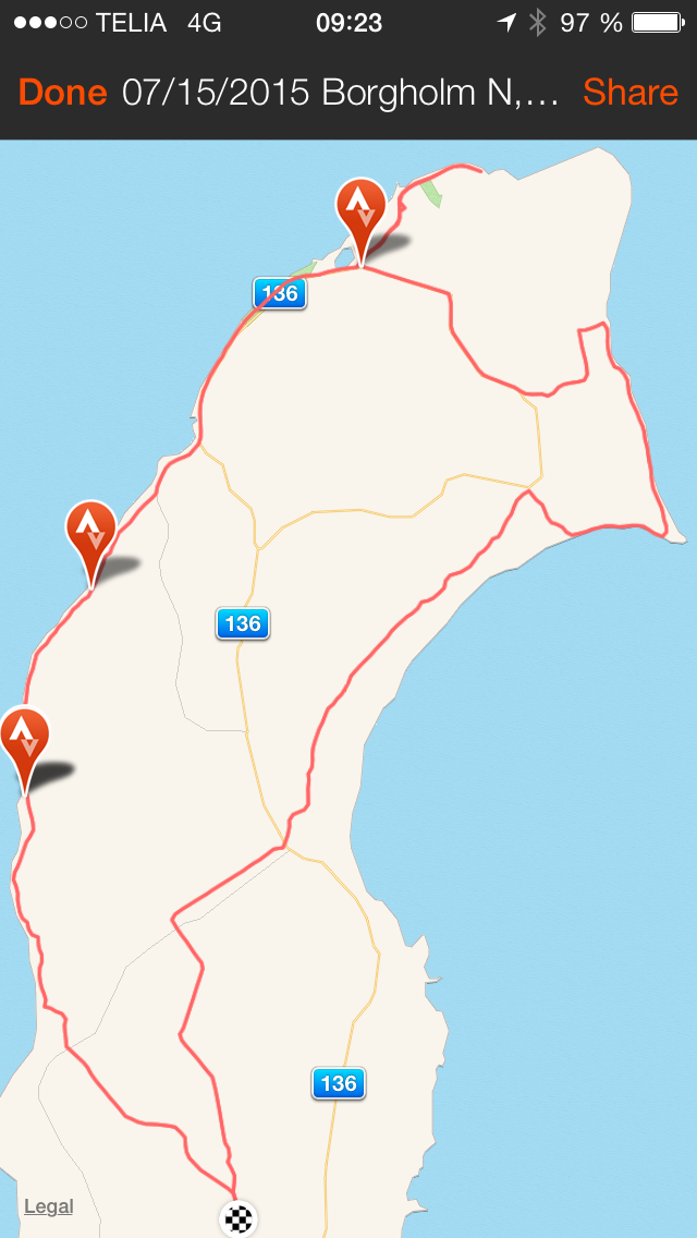 Vi cyklade som längst 59 km och utgick då från Vedborm, cyklade längs kusten upp till Långe Erik och sedan ner på andra sidan via Böda och hem igen. Vi cyklade både på Ölandsleden och Bödaleden. Bödaleden är utmärkt med vita prickar på träden och är perfekt för MTB.