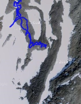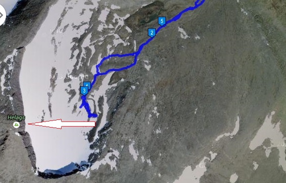 Igår när jag laddade upp vandringen på funbeat så såg jag på satellitkartan att vi var helt fel ute. Hade vi fortsatt där vi vände så hade vi kommit upp på en avsats som inte ledde någonstans – och då hade vi nog inte hittat tillbaka. Vi skulle ha gått längs kammen upp men vi gick någon väg så att vi hamnade vid glaciären.