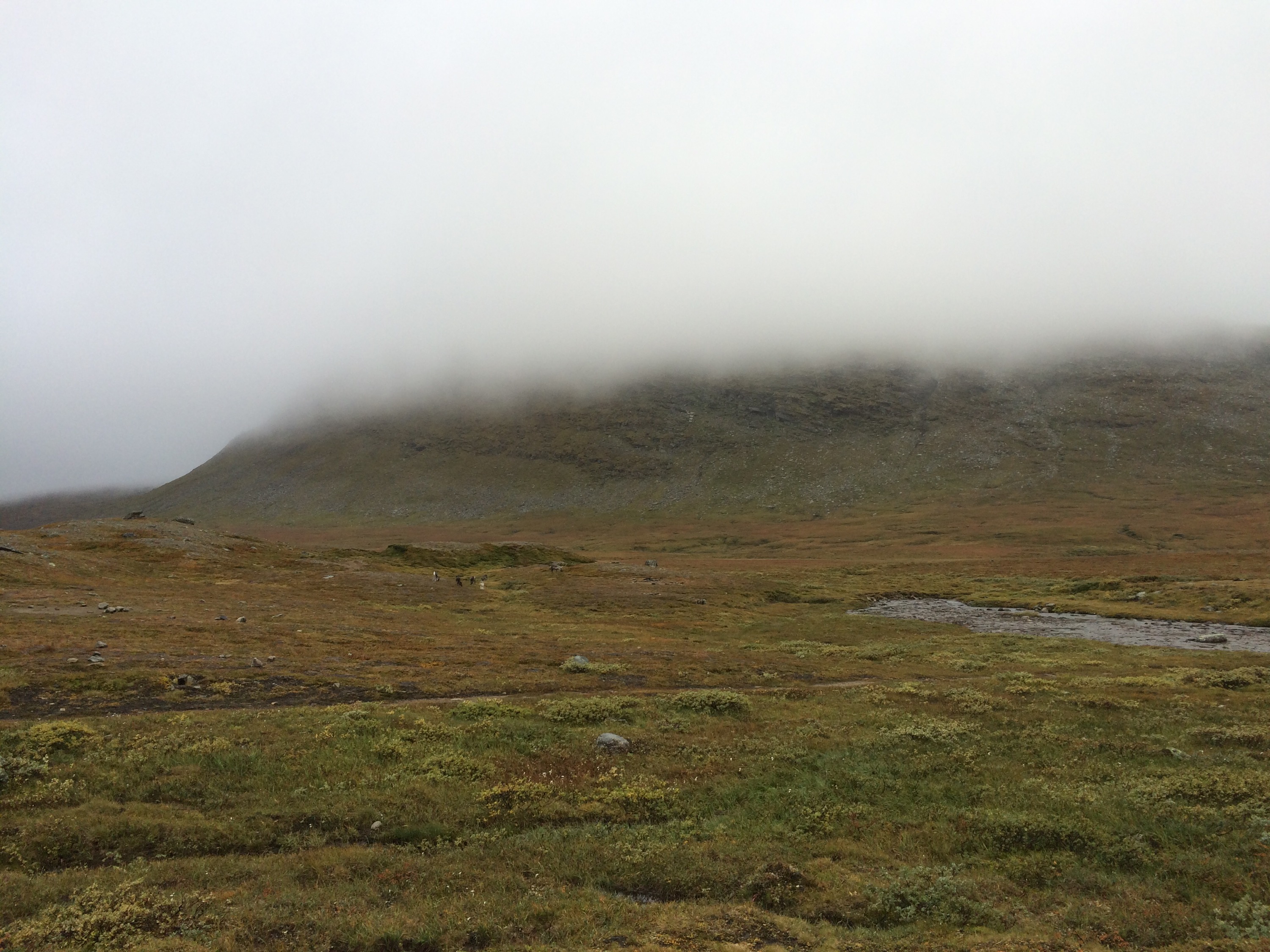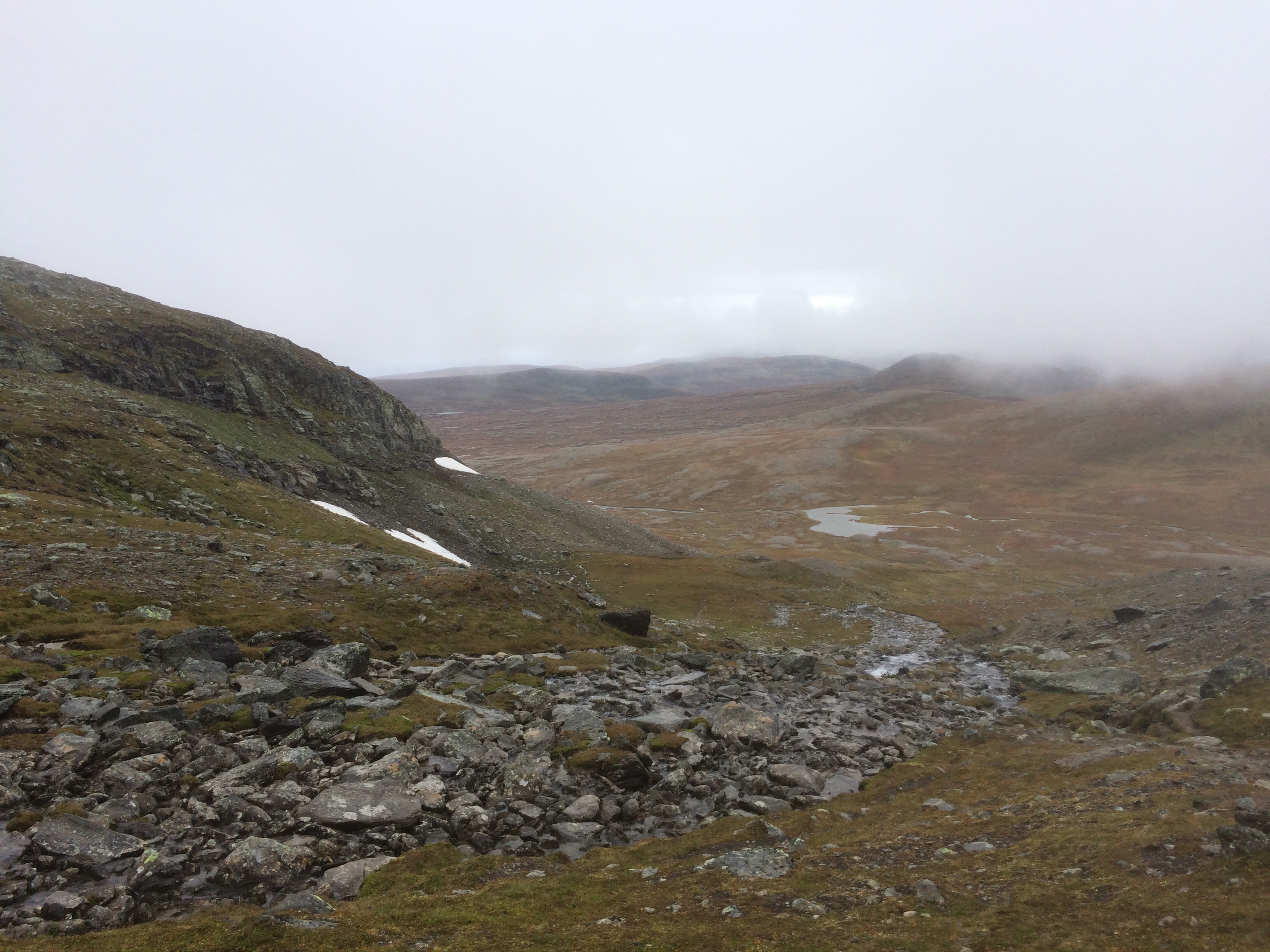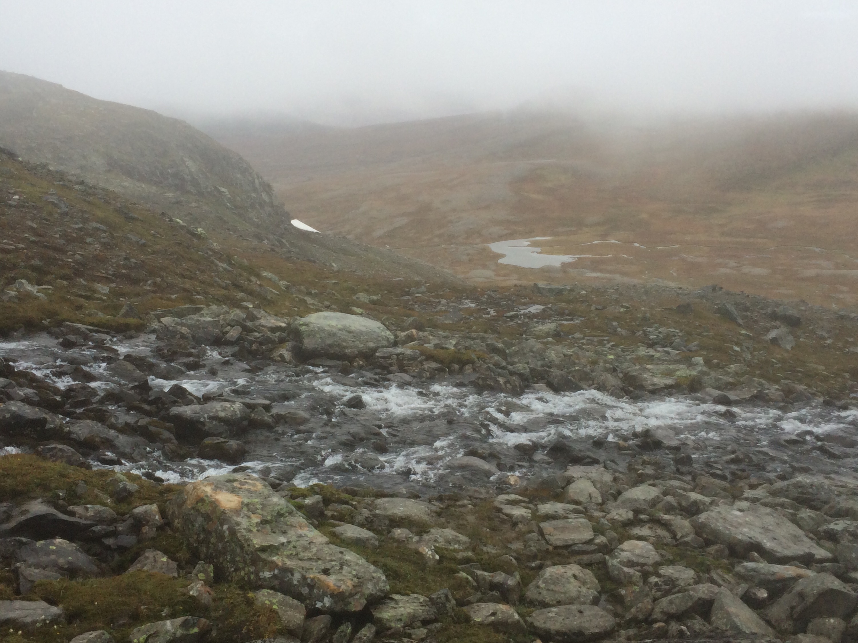 När stigen tog slut så följde vi rösen. Vi hamnade i ett ”hav” av stenar/block men såg fortfarande rös lite här och där så vi klättrade uppför. Stenarna var jättehala så det var rätt läskigt. Till slut var dimman så tjock så vi såg inte långt framför oss och röset slutade vid ett litet stup – på andra sidan var en vägg av stenblock rätt brant uppför. Då kände jag att jag inte ville fortsätta. Tittade på min mobil för at orientera mig lite genom geocaching-appen. Såg att vi hade ca 600 m kvar (fågelvägen) till cachen på toppen. Men eftersom vi inte ens visste åt vilket håll vi skulle och det var hala stenar så kändes det säkrast att vända. När vi vände oss om så såg det lika ut överallt och ett tag tänkte jag att nu får vi ringa fjällräddningen – vi kommer aldrig att hitta härifrån…