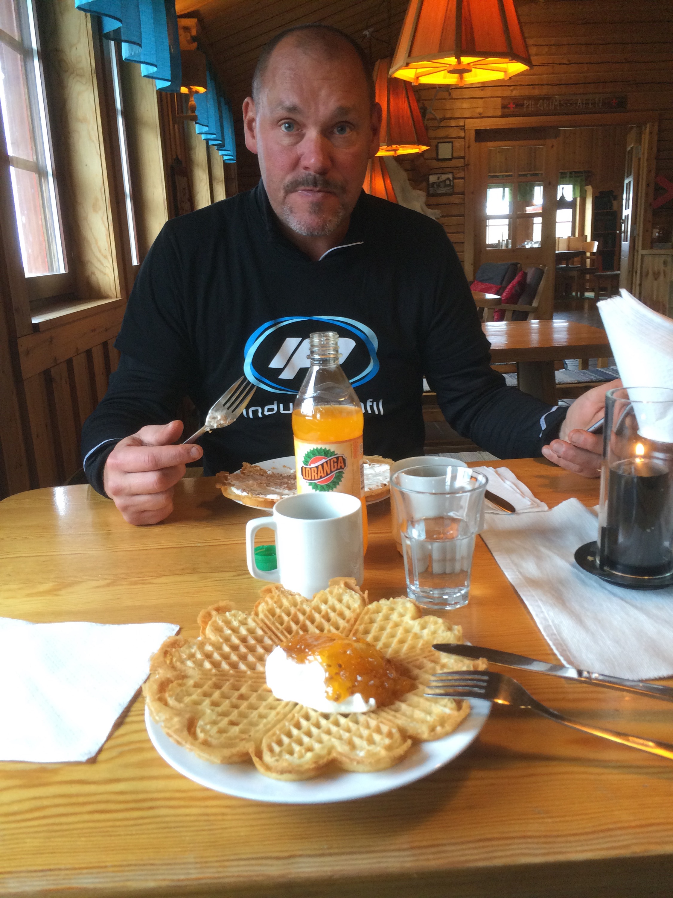 Vi hade förberett med frystorkad mat och varmvatten i termos för vi tänkte sitta uppe vid toppen och äta lunch 😉 Istället skyndade vi oss ner till fjällstationen och köpte varsin våffla.