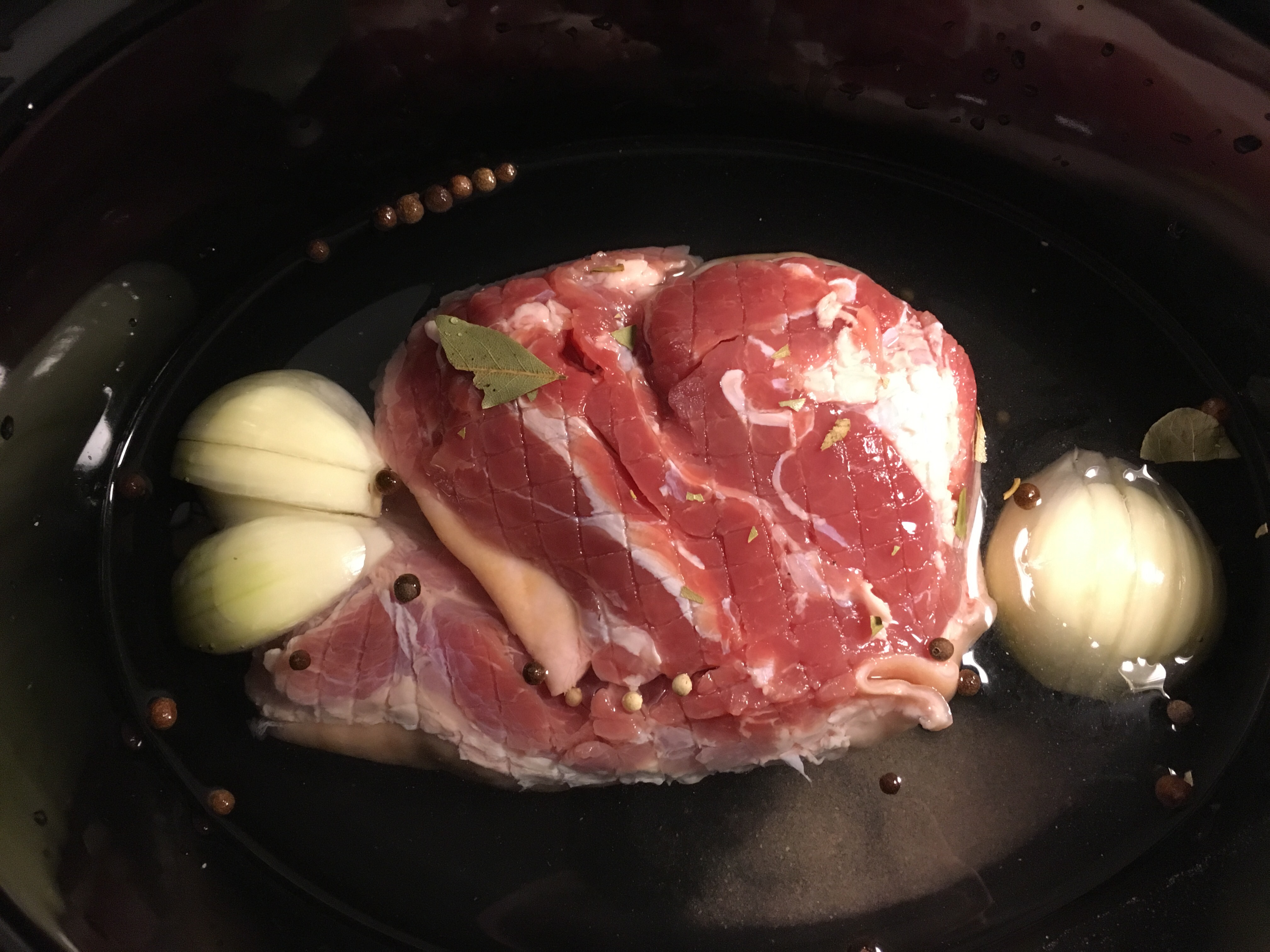 Laddade Croc-Poten med fläsklägg i går kväll. I morse var det klart – bara att sleva upp i matlådor och stampa ihop lite rotmos till.