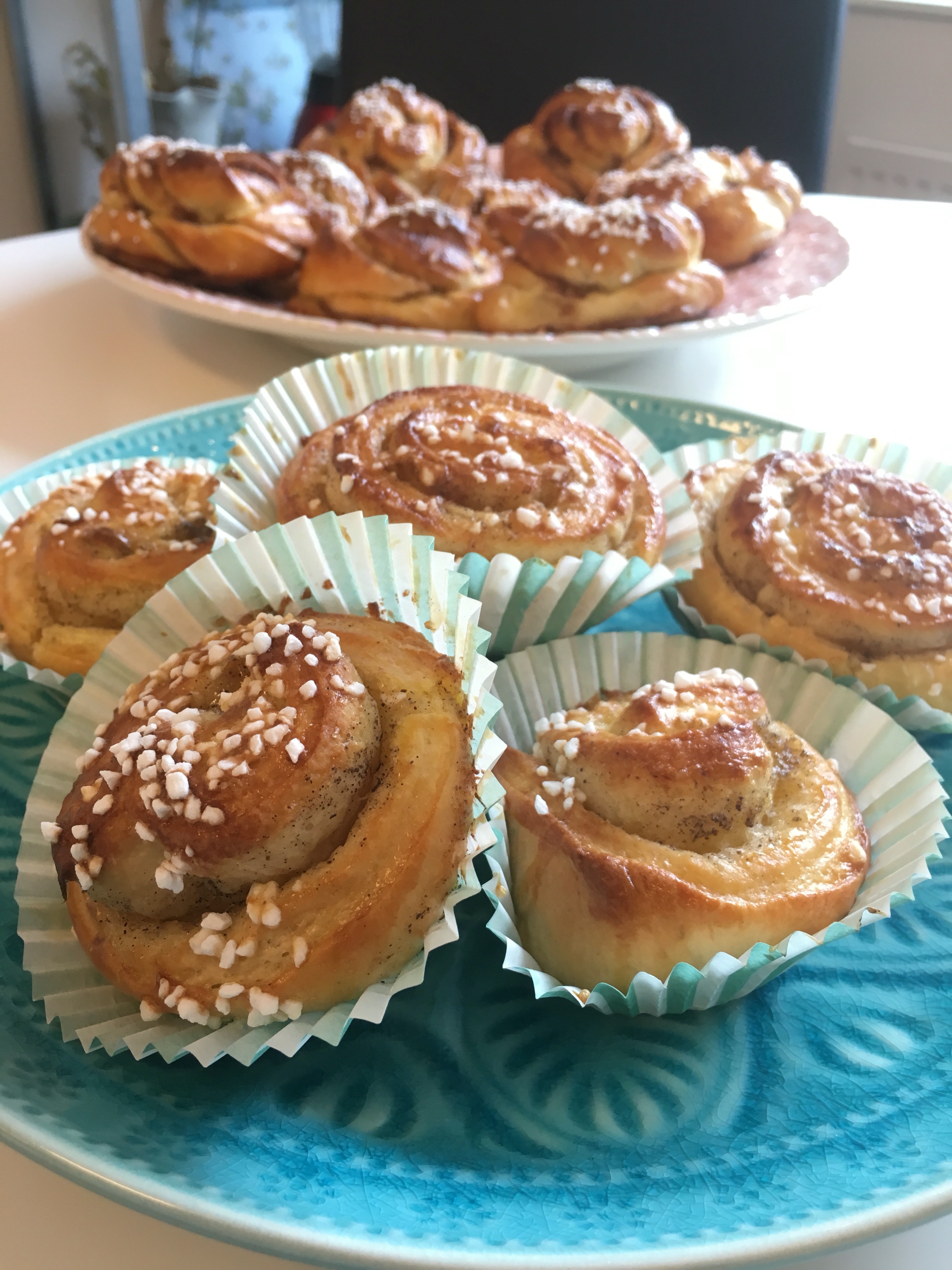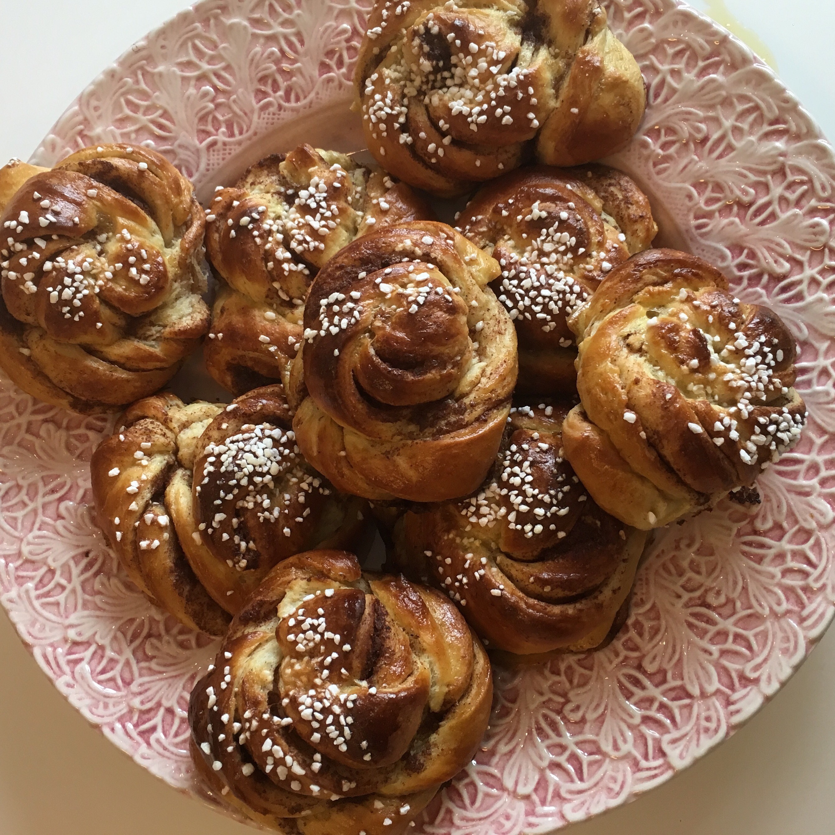 Sedan stora kanelbullar, vaniljbullar och en vitchoklad-kladdkaka med hallongrädde.