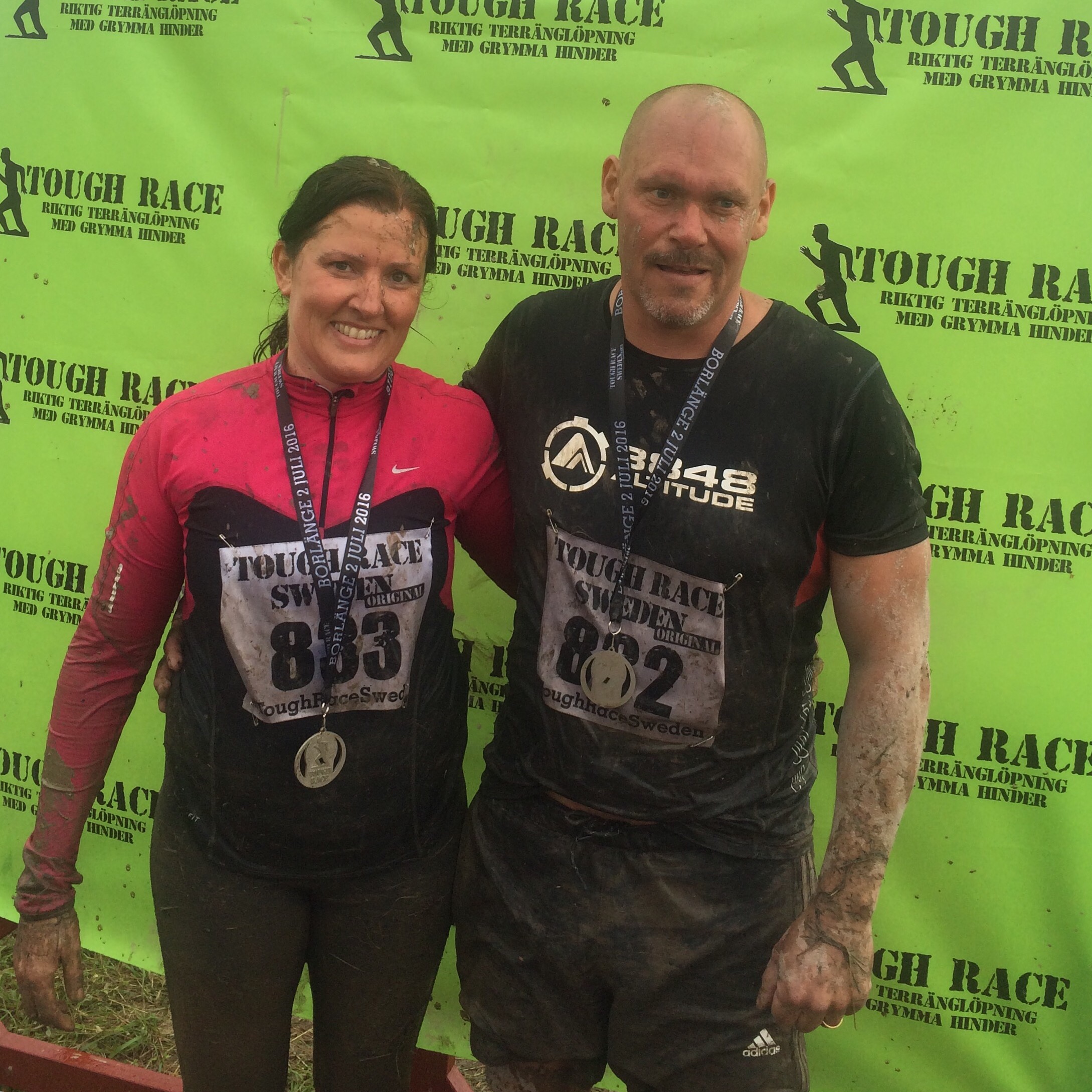 Sedan började hinderbanan och jag var fegare i år – det satt i bakhuvudet att hindren kunde vara snorhala. På ett hinder fick jag riktig panik och klamrade mig fast vid en stock och kom inte vidare. Det var en pyramid som var ganska hög med 4 eller 5 stockar man skulle över (och mellanrum mellan dem) När jag var nästan längst upp så vågade jag inte slänga över benet över den översta stocken för jag var livrädd att tappa greppet och halka ner. En tjej stod på andra sidan och försökte peppa mig men jag var gråtfärdig. Maken såg det hela och kom tack och lov till undsättning – han klättrade upp och mötte mig så att jag kunde hålla i honom när jag skulle över toppen. ❤