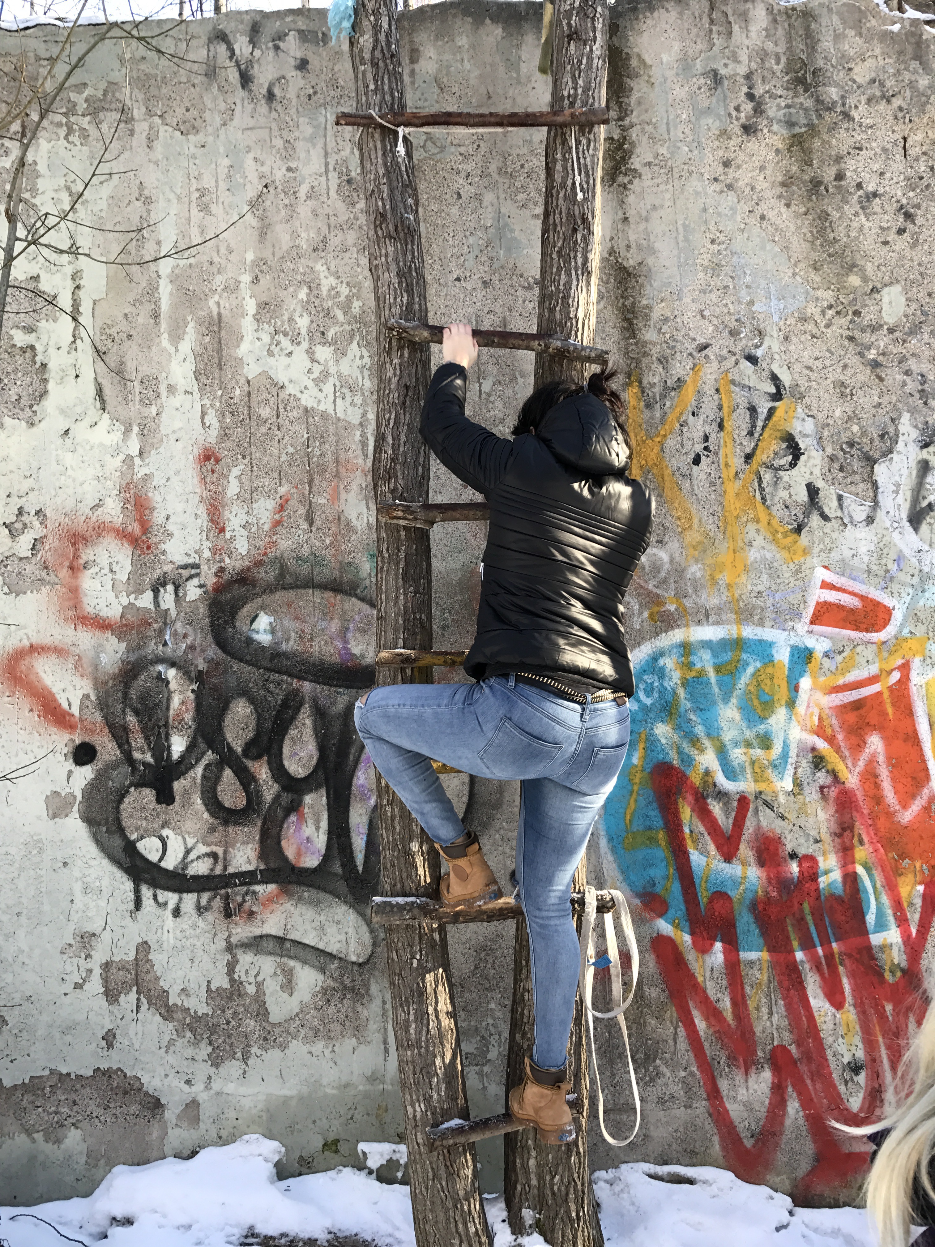 Vi gjorde några tappra försök att klättra upp men stegen kändes inte helt pålitlig och det var halkigt på pinnarna. Så vi gick flera varv runt muren för att försöka hitta en alternativ väg in. Det fanns två igenmurade hål där det även satt en lapp om att det var förbjudet att gå in i byggnaden. Vi var ju ”bara där för att leta efter en geocache” om nån skulle fråga 😉