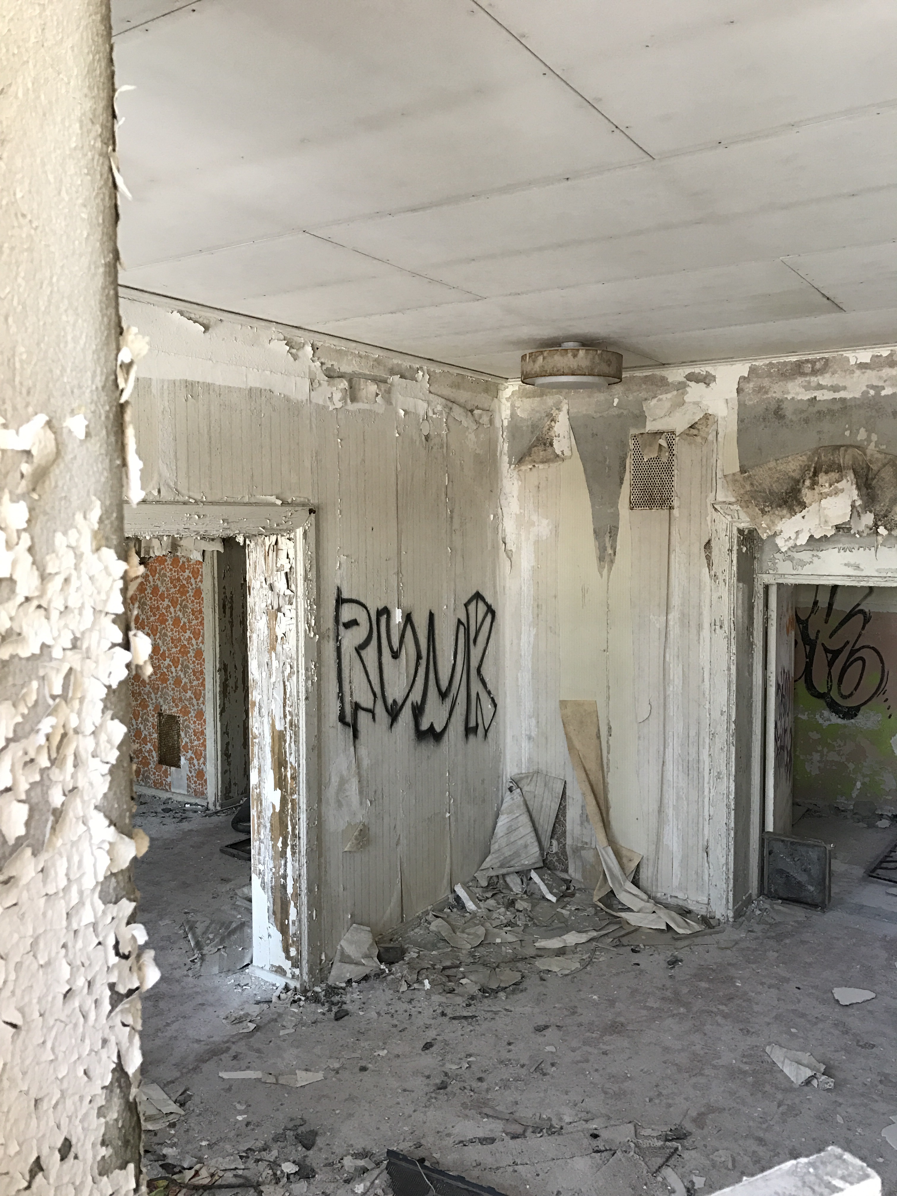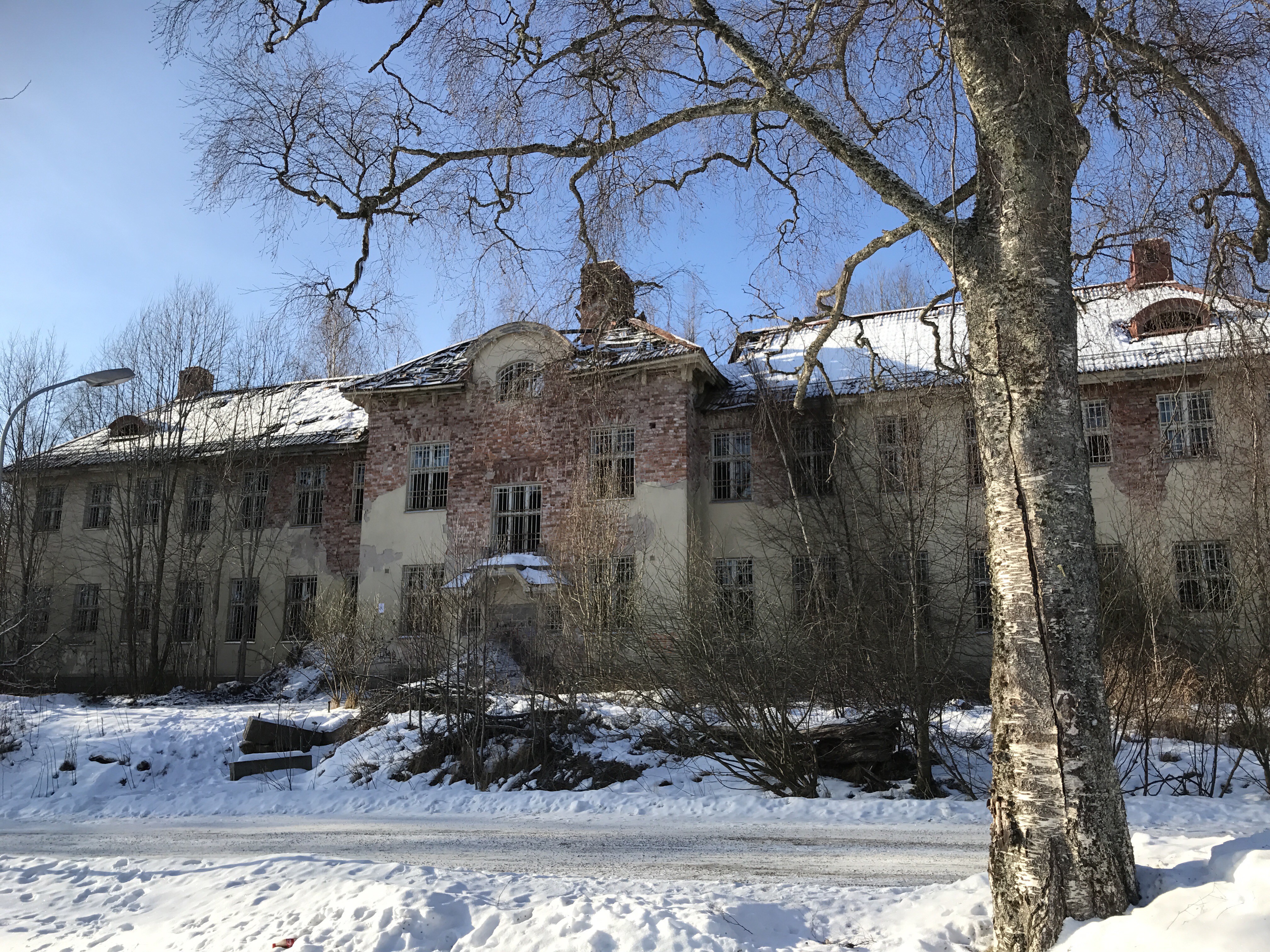Vårt första stopp blev dock Solbackens Sanatorium men där satt stora skyltar om tillträde förbjudet och varning för hunden. Vi sprang ändå ner till byggnaden för att titta lite utvändigt och kanske kika in – men jag och Malins yngsta dotter blev så rädda att någon skulle släppa hundar på oss så vi skyndade tillbaka till bilen.