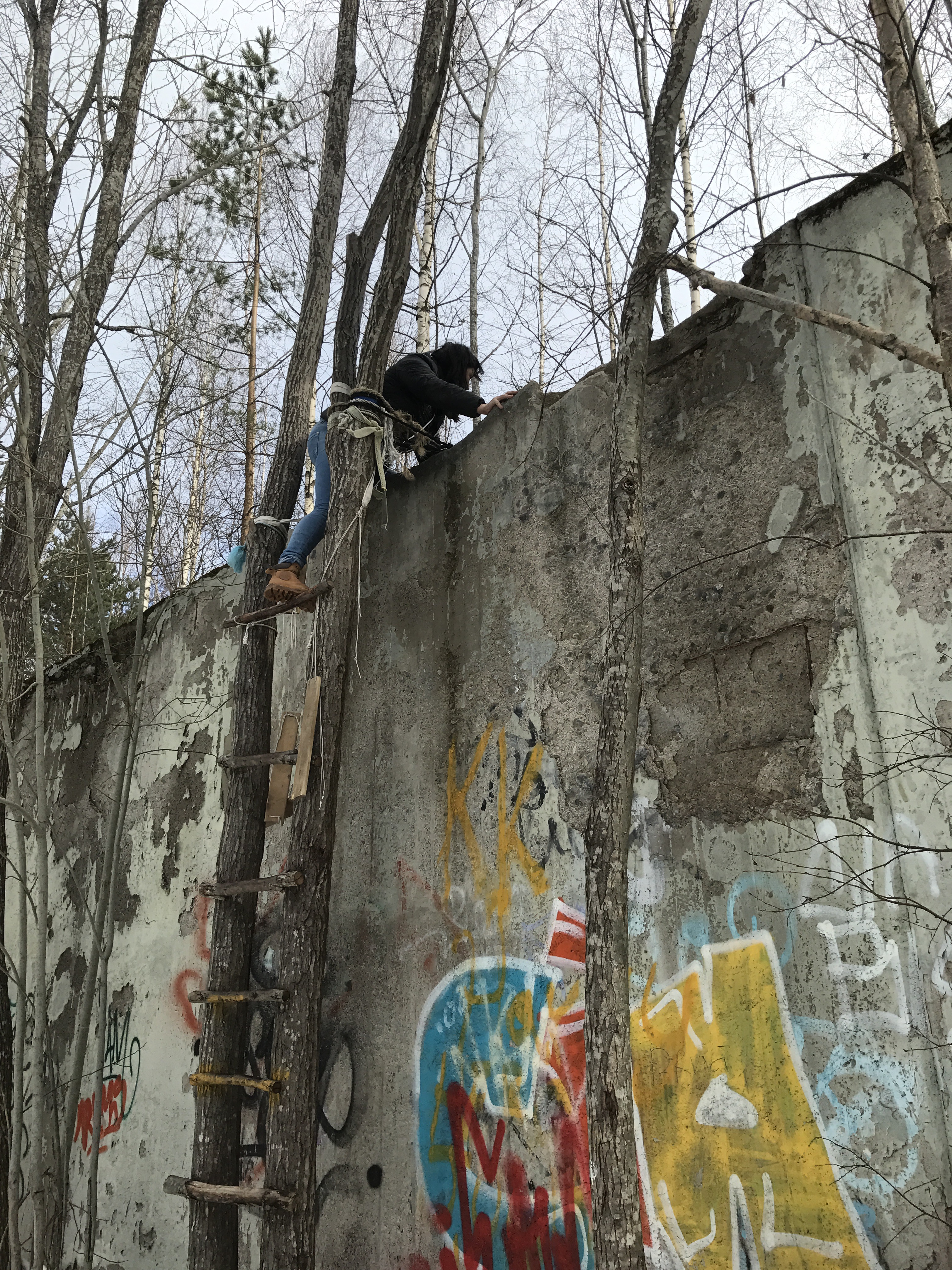 Tänkte strunta i det och bara stanna utanför och ”hålla vakt” – men gjorde ett nytt försök med muren. Och dra på trissor – jag kom över – men jag var livrädd.