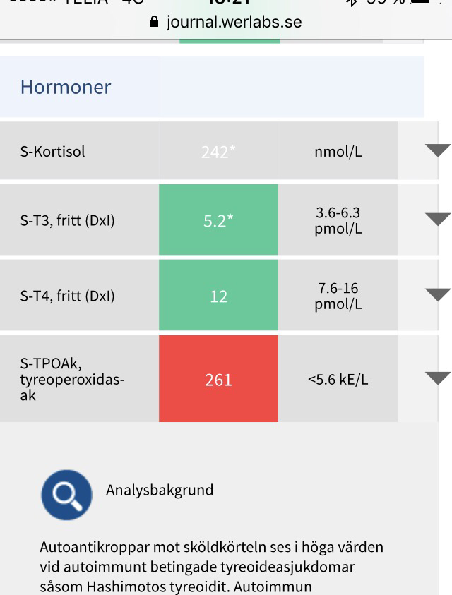 Jag hade ett högt värde på det som påvisar autoimmun tyreoideasjukdom såsom Hashimotos. Det har jag haft tidigare också, men de andra värdena på sköldkörteln var bra så i nuläget finns ingen anledning till någon medicinering.