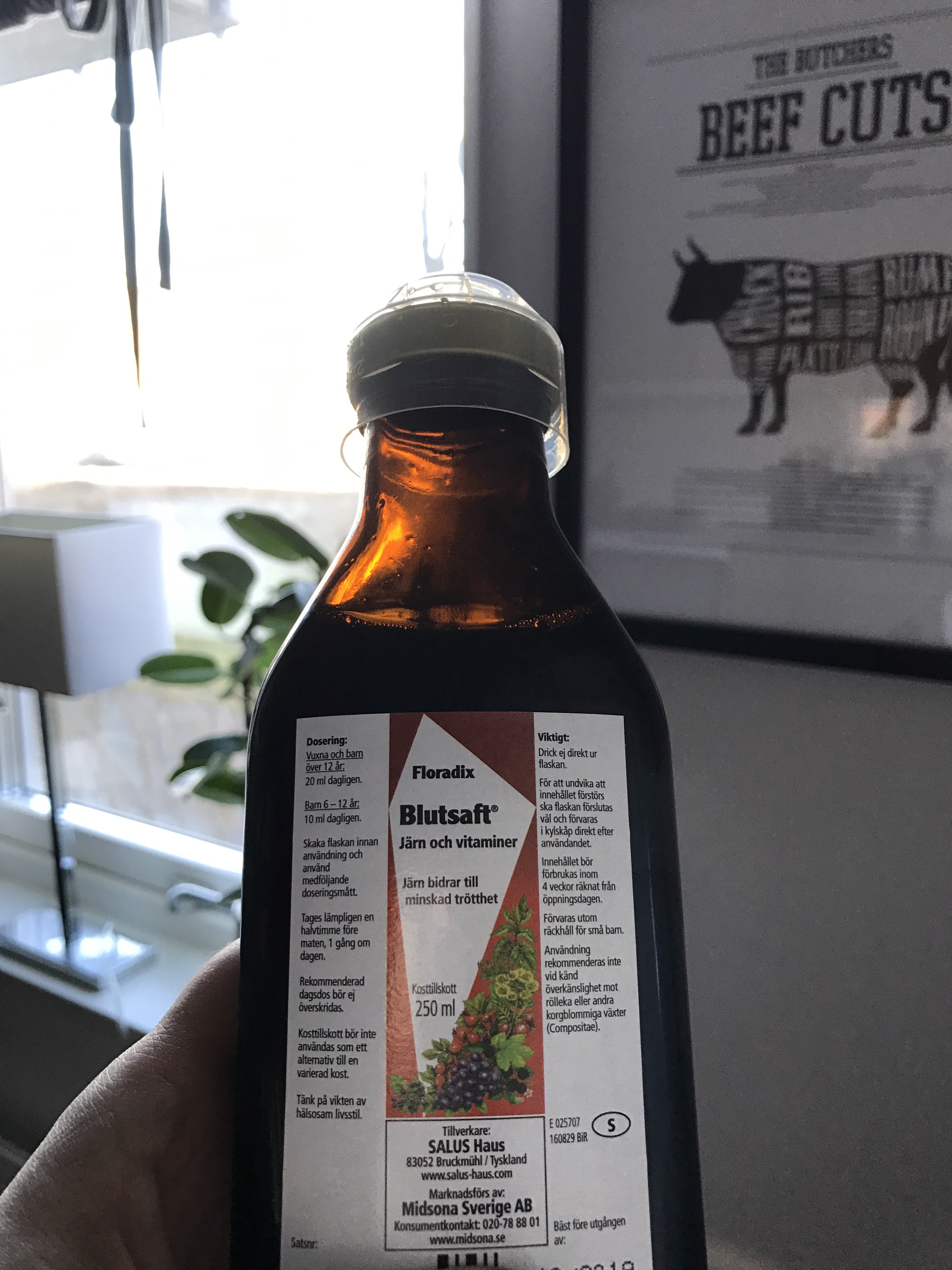 Sedan hade jag ett lågt värde på det som visar järndepåerna i kroppen så nu har jag varit och köpt mig lite Blutsaft så få vi se om det blir bättre.