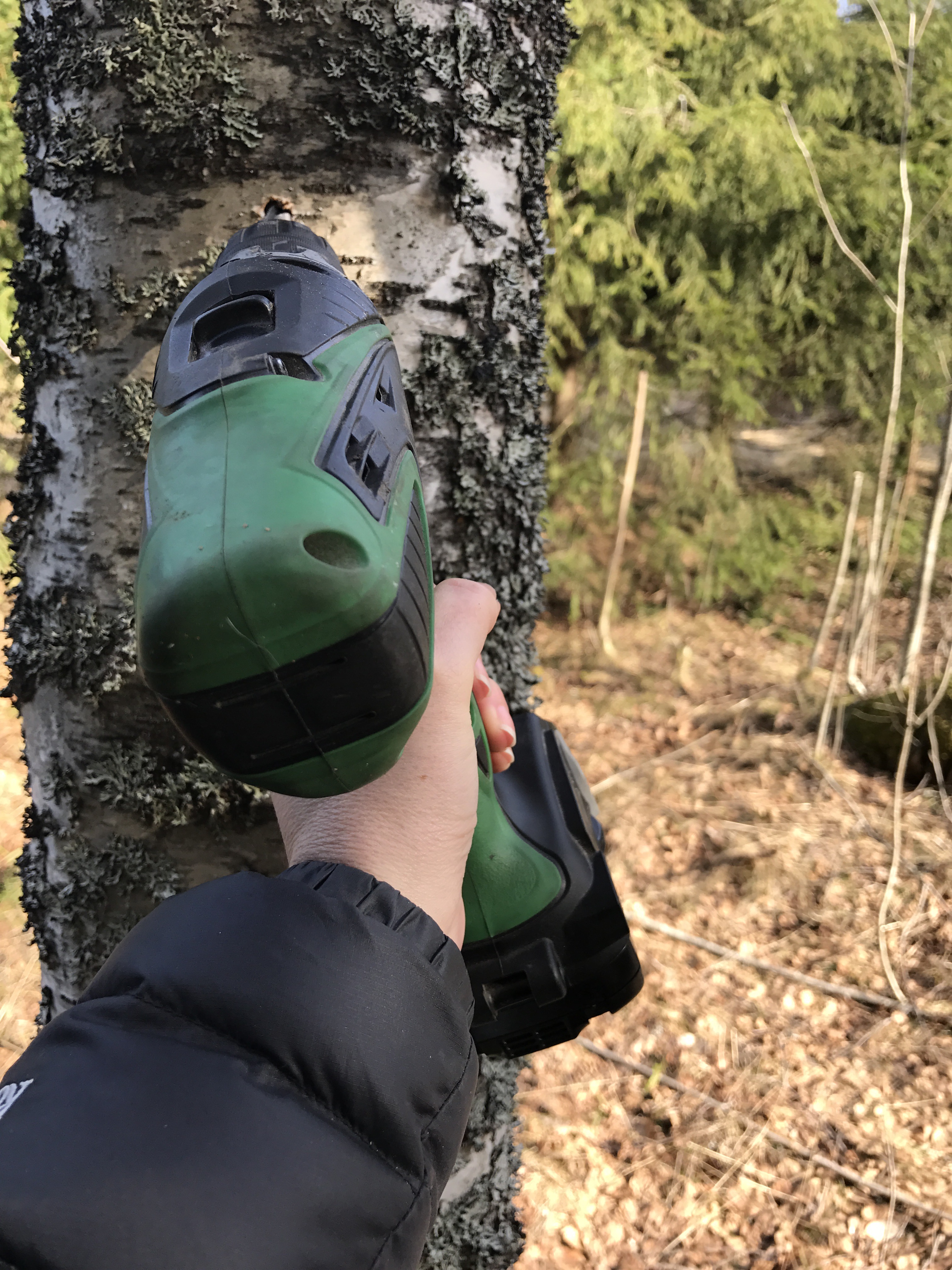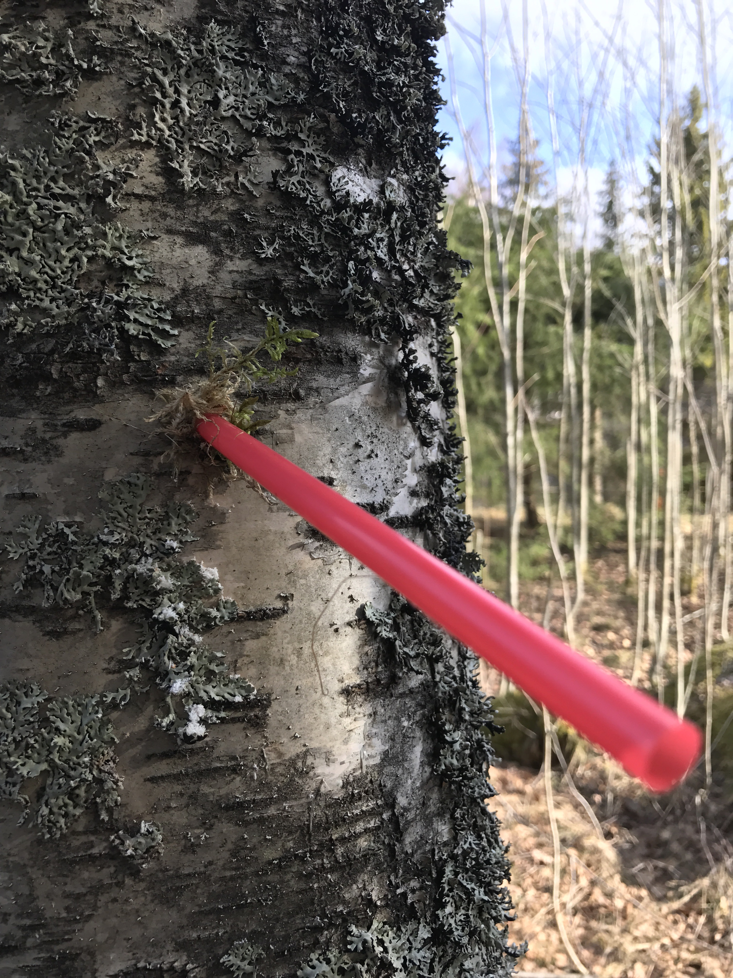 Det är inte alls svårt att tappa björksav. Man borrar ett hål och stopper sedan i ett sugrör eller en tunnare slang, binder fast en flaska och väntar med spänning.