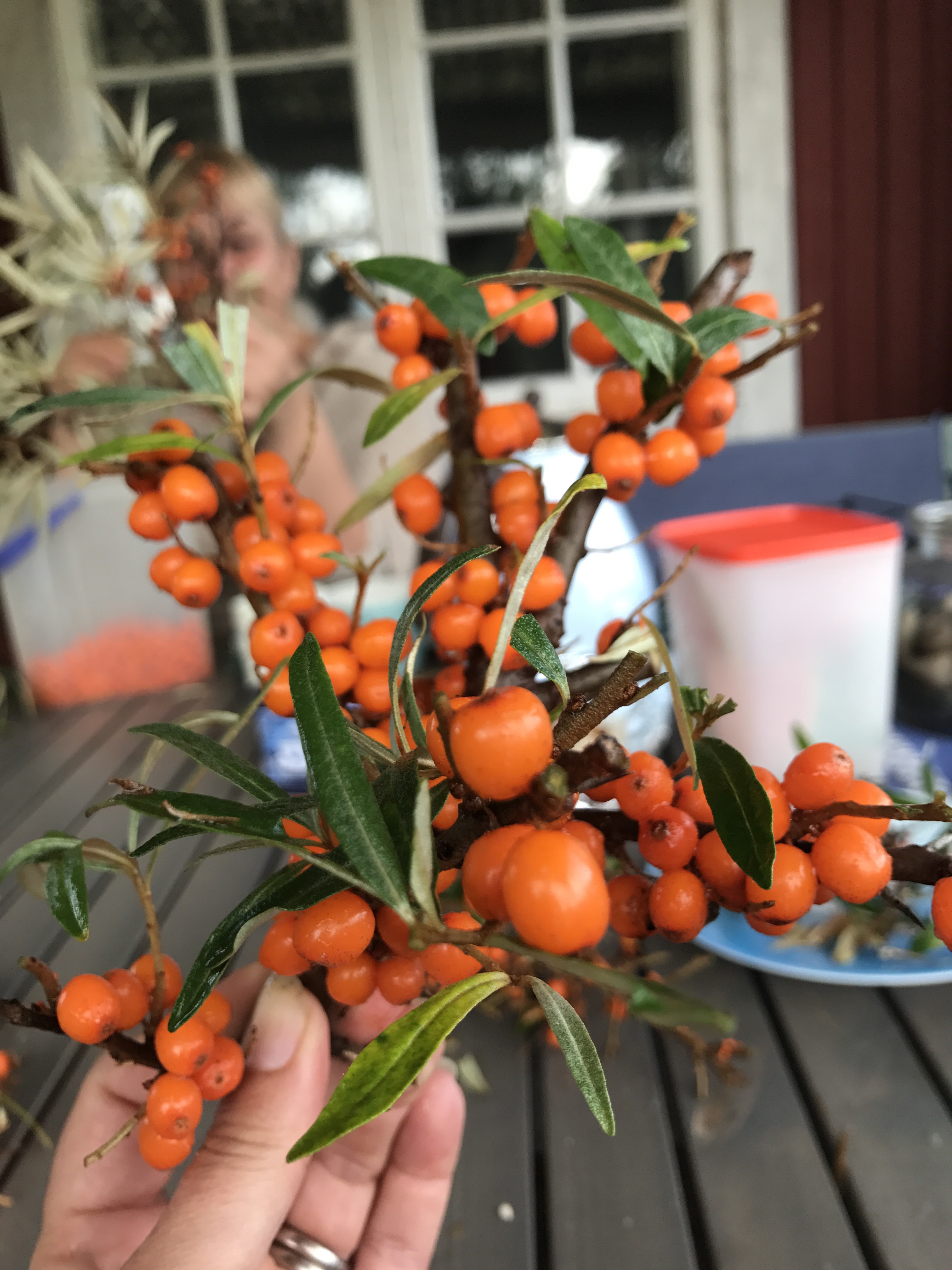 Det tar väldigt lång tid att plocka bären, de sitter ganska hårt på grenen och man vill ju inte klämma sönder dem. Det ska tydligen finnas lika mycket C-vitamin i ett litet bär som i en hel apelsin.