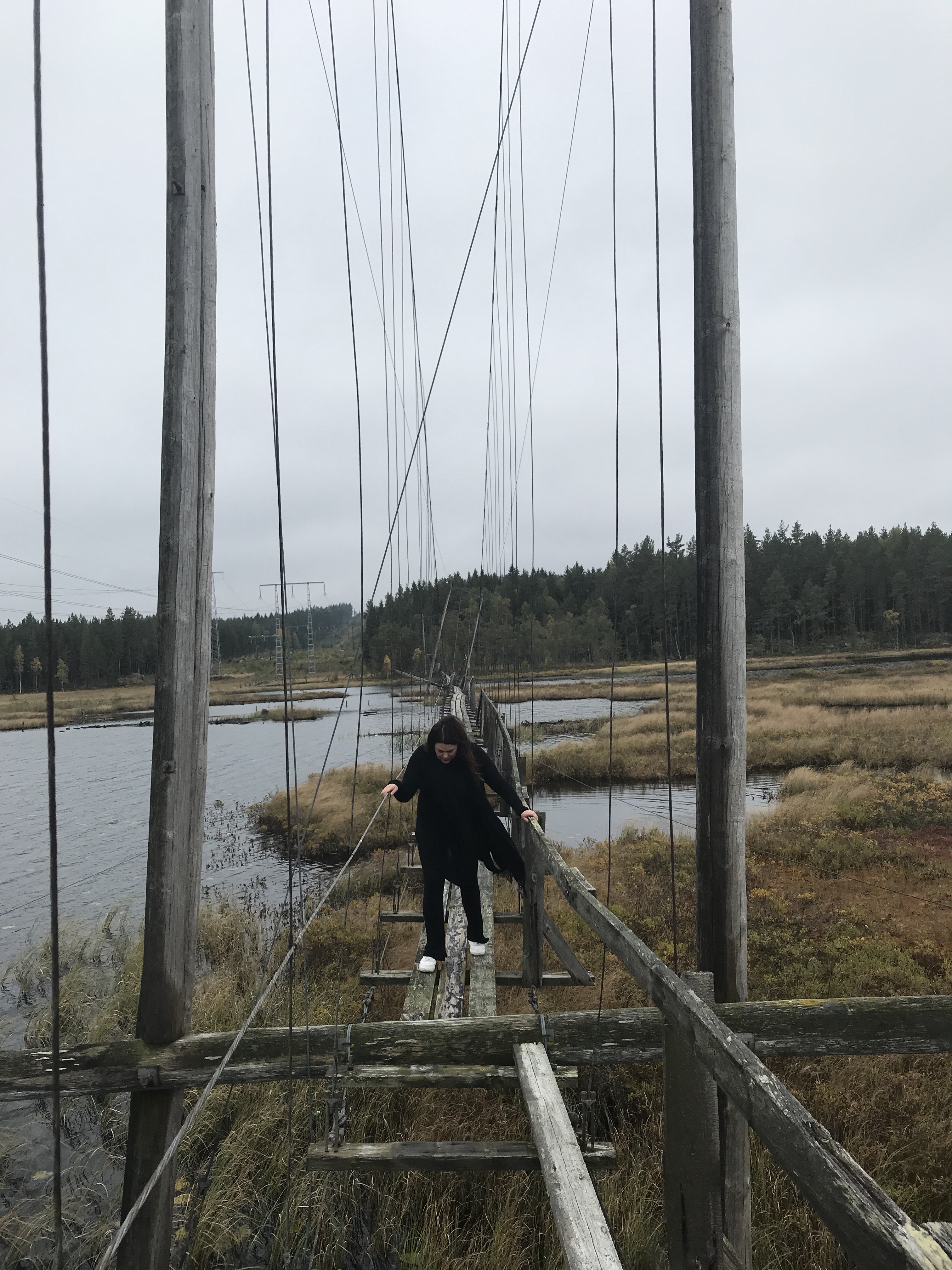 Efter att ha stapplat ut på ungefär halva bron och det på vissa ställen bara fanns en bräda att gå på (som dessutom knakade) så vände vi. Jag vet ju att när man väl kommer fram till cachen så måste man åla sig ut på en stock – och det såg jag att nog inte skulle våga.