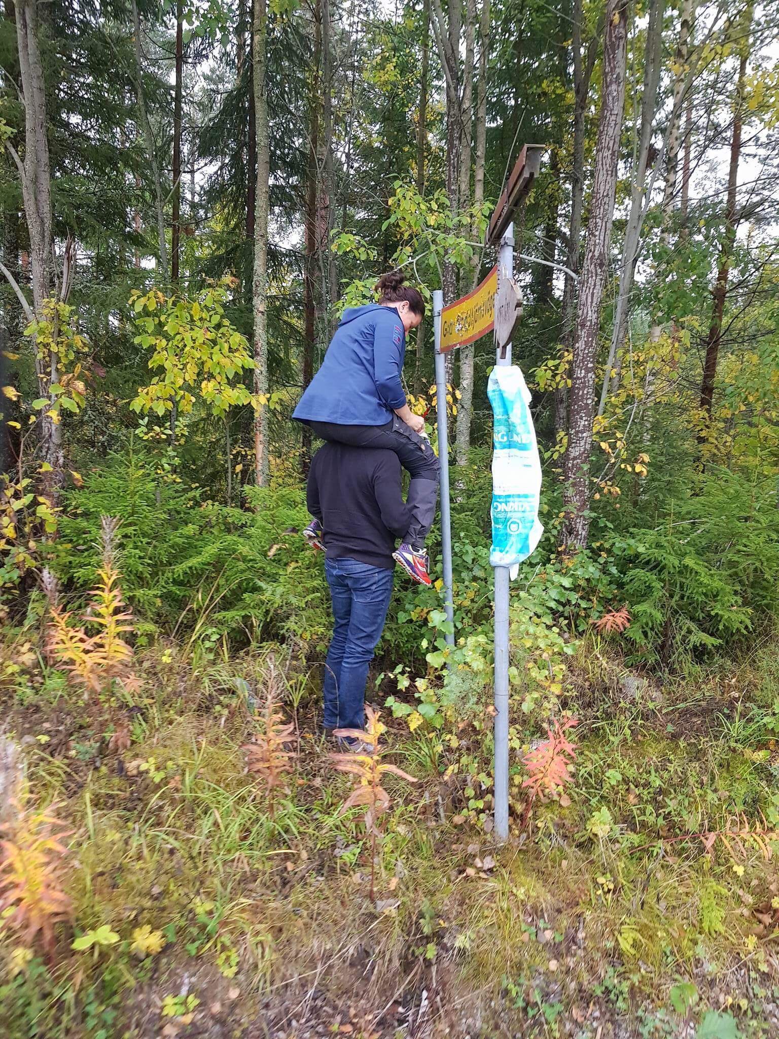 Så vi åkte vidare mot en geocache i närheten som heter Raketen. Undrar vad det är för grej egentligen? Mitt ute i skogen…Nåväl – den stegen satt löst så där vågade jag inte heller klättra.