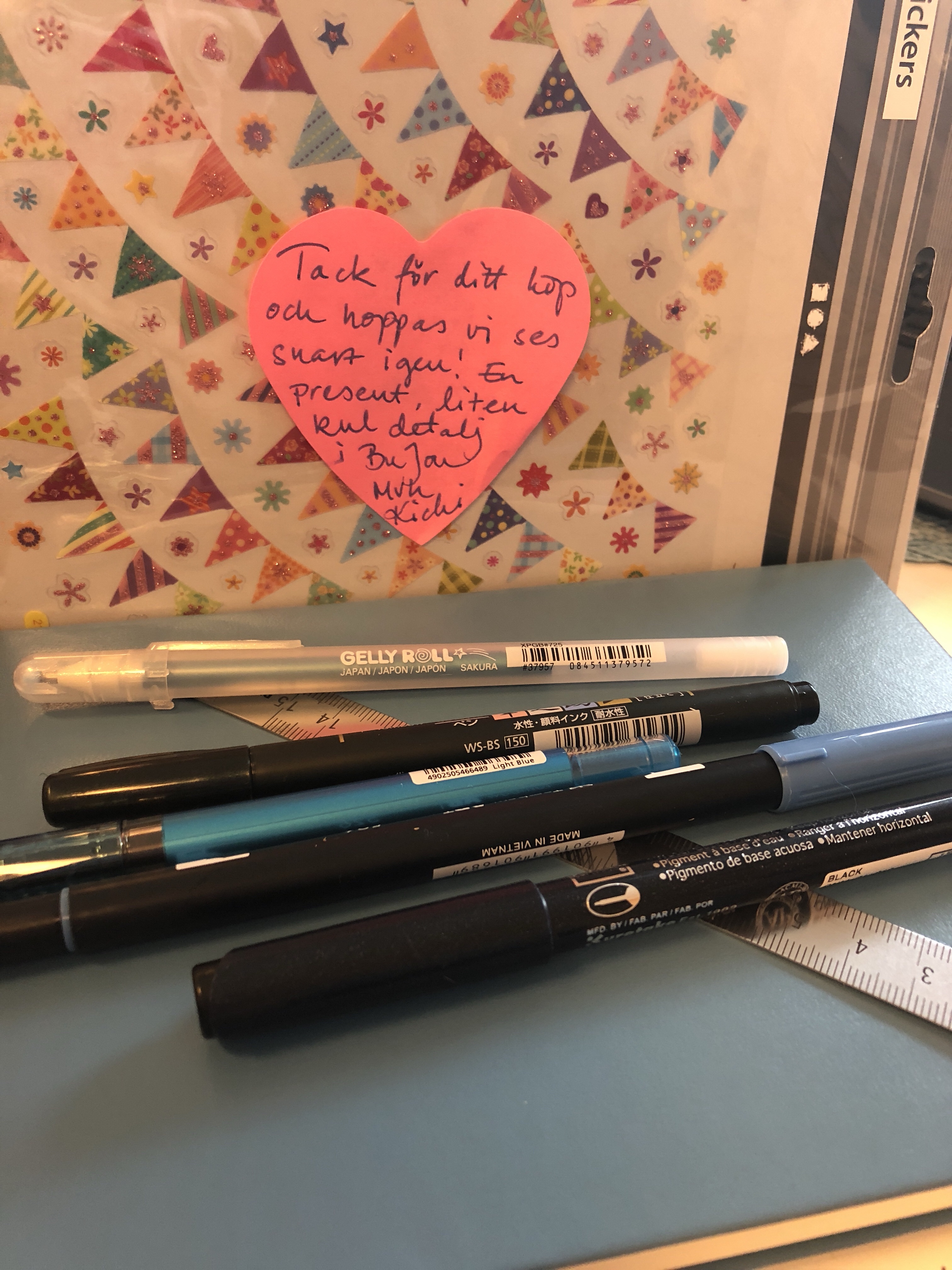 Fick den idag och har bara hunnit testa lite. Trist att jag valde en bok med ”för tunna sidor”, det syns igenom när man skriver och det blir inte så snyggt.