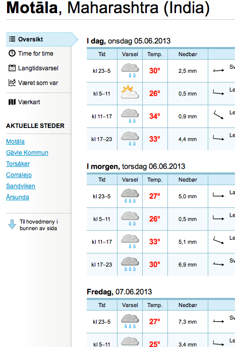 Skulle kolla vädret på yr.no igår – vad det kan tänkas bli framåt fredag nästa vecka…Blev jätteglad vid en första anblick; såg ut att bli riktigt varmt…33-34 grader 😉 MEN det var visst Motala i Indien 😉 Igår var det vilodag för mig för jag hade lite ont i knäet. Inte det vanliga (löparknä) utan…