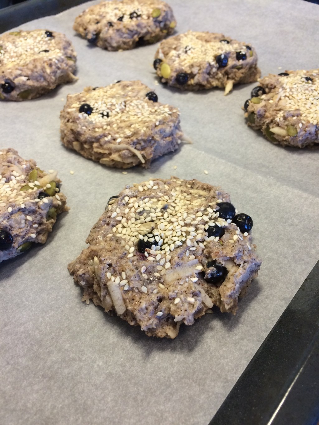 Medan min ekologiska hårfärg verkar (ca 2 timmar) så passar det bra att baka något. Jag hittade ett recept hos Jessica Clarén som jag har testat nu på morgonen. De står i ugnen nu så jag har inte provsmakat dem – men det doftar ljuvligt 😉 Jag hade inget durramjöl så jag tog bovetemjöl…